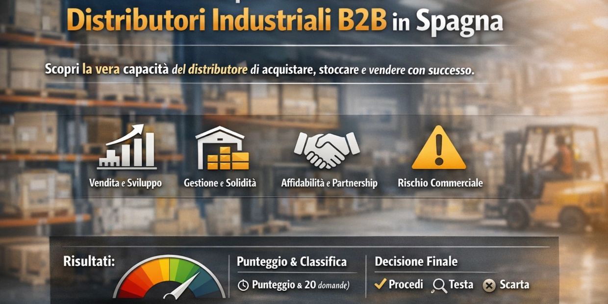 Il presente test ha l’obiettivo di qualificare un distributore industriale operante nel mercato B2B spagnolo, inteso come soggetto che acquista, stocca e rivende prodotti, fornendo una valutazione strutturata della sua reale capacità di generare vendite e sostenere lo sviluppo commerciale nel tempo.